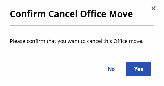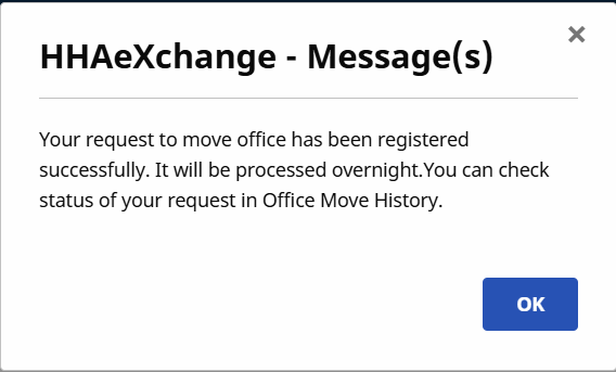 A message displays to confirming the office move. The Office Move processes overnight.