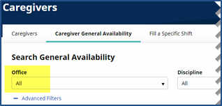 Available to Work filters pull information from the Caregiver’s Availability page, with details from all assigned Offices whether the Primary or Secondary Office is selected.