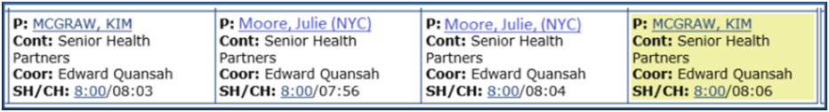 Hovering over either the Caregiver’s Name or Patient’s Name displays visit details.