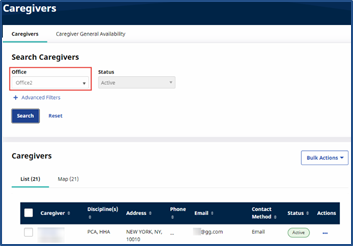 Caregivers assigned to a Patient’s Office (either Primary or Secondary) can be selected in a Patient’s Master Week. When performing a Caregiver Search, the results generated shows all Caregivers who match the filter selection(s). The Office field defaults to the Patient Office (un-editable).