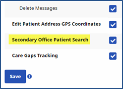 Because Caregivers can be assigned to multiple offices, this function is open to all Offices the Caregiver is assigned to. A permission titled Secondary Office Patient Search is available to accommodate a user’s permissions for a Secondary Office(s).