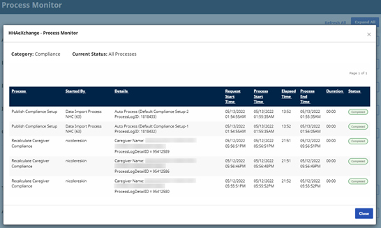 When the Publish button is selected, a warning message generates alerting the user that publishing updates to the Compliance Setup prompts the system to recalculate Caregiver Compliance for all associated Offices. Select Yes to proceed with publishing (apply new compliance rules execute recalculation). Go to the Process Monitor under Admin > Process Monitor to check the calculation status.