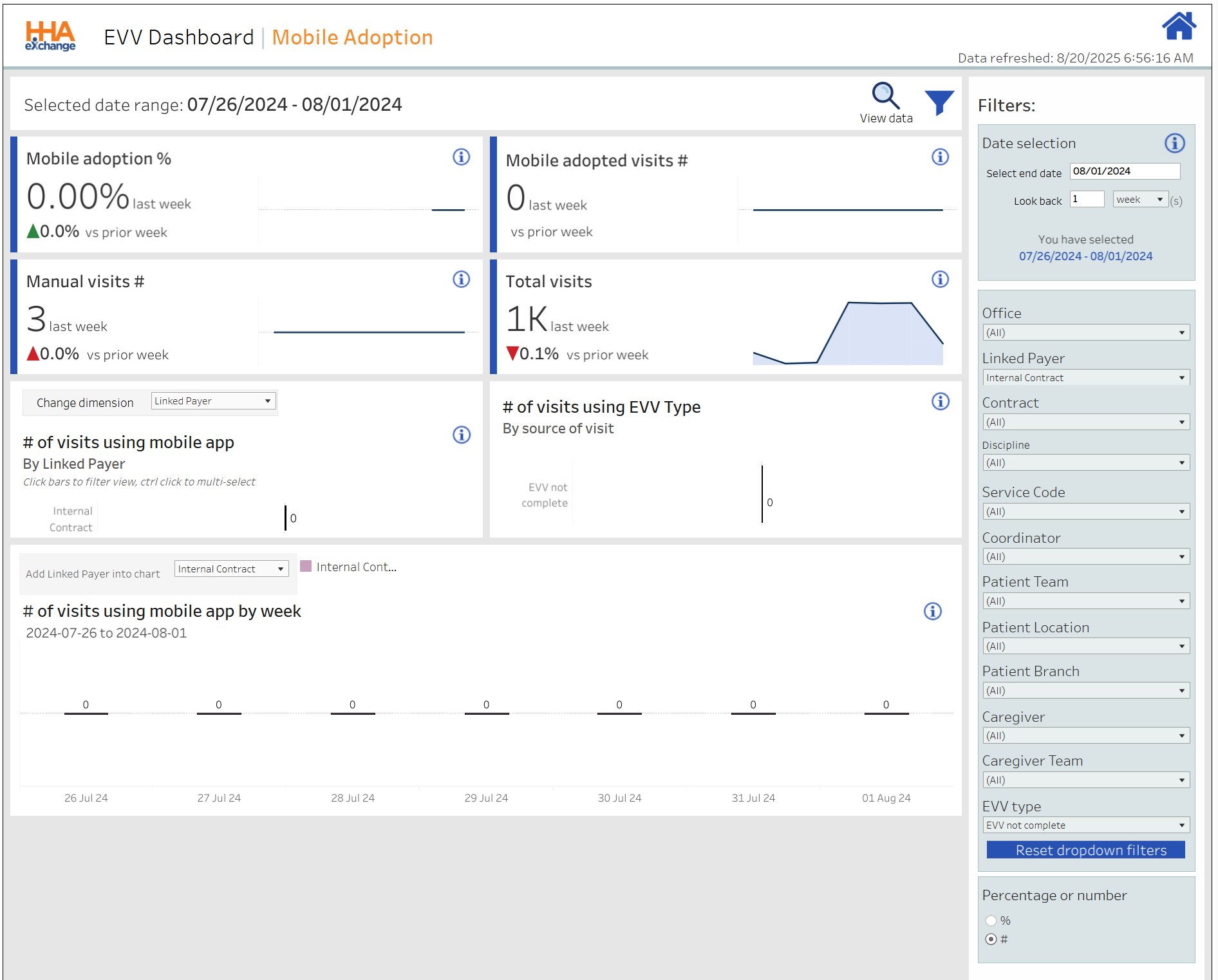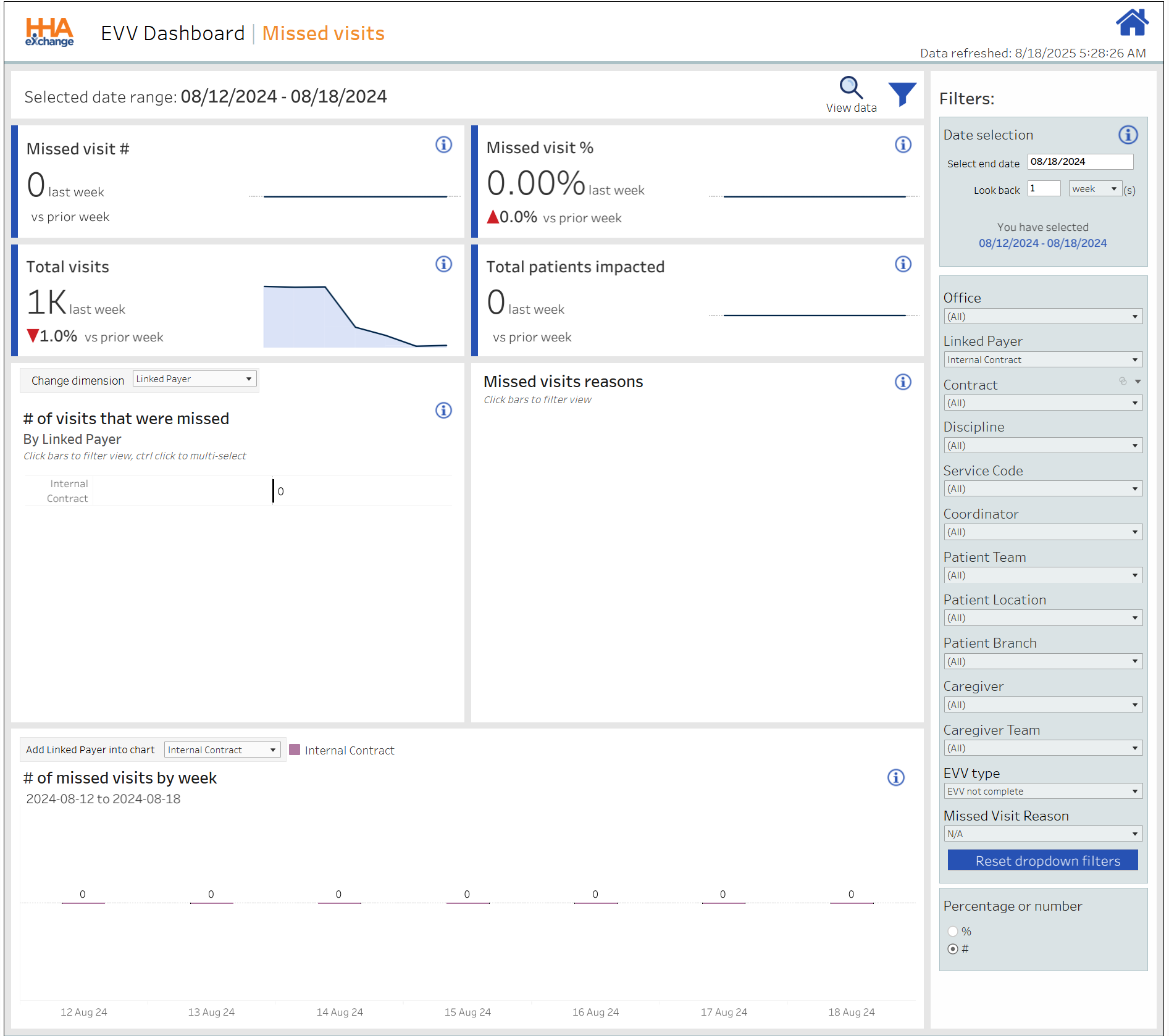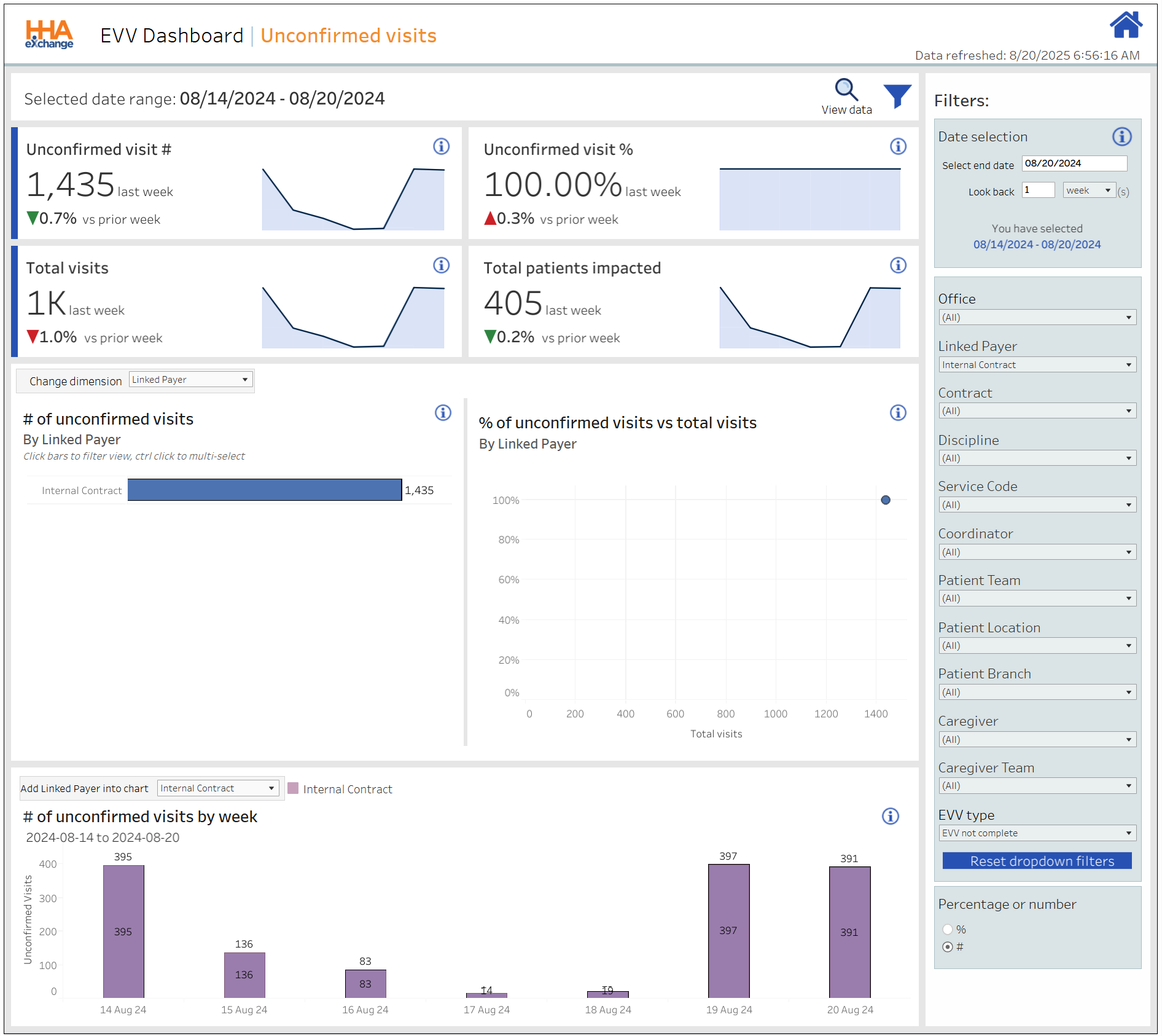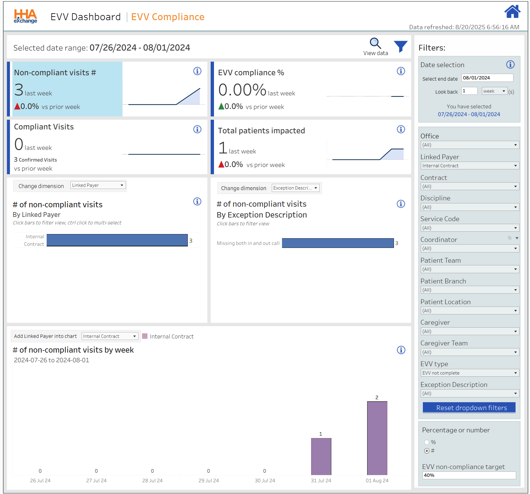 Percentage of EVV-compliant visits (Confirmed, excluding Exceptions) for the week in comparison to the prior week. |
