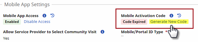 In Mobile App Settings, click the Generate New Code link in the Mobile App Access field.