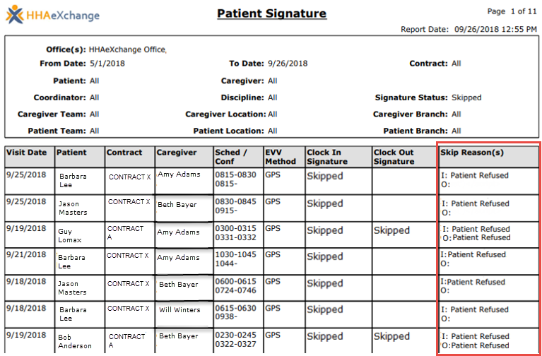 Regardless of whether the call appears on the Call Dashboard, if the Caregiver has skipped the signature, a Note is generated and a Timesheet Required flag is set on the Visit Details page. The system can generate a Patient Signature report under Report > Visit > Visit > Patient Signature capturing reasons when a required signature is skipped.