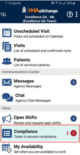 The informational Compliance screen on the Mobile App is accessed from the main screen, as seen on the image above. The encircled number in red in the main page indicates the number of items needing attention. Select the Compliance option to view high-level information such as Type, Due Date, and Completed Status for all the Caregiver’s Compliance items.