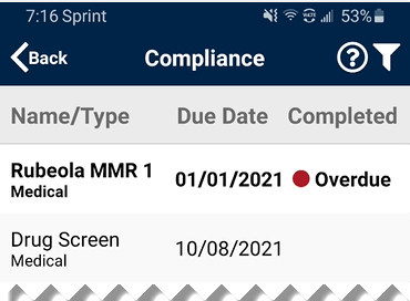 The Mobile App Caregiver Compliance Alerts feature displays a Caregiver’s Compliance status (based on Discipline) directly on their Mobile App; informing them of completed as well as upcoming medical and evaluation due dates to assist with remaining compliant.