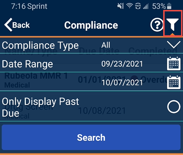 Select the available information such as Compliance Type, Date Range, or select the Only Display Past Due radio button to display only the due items.
