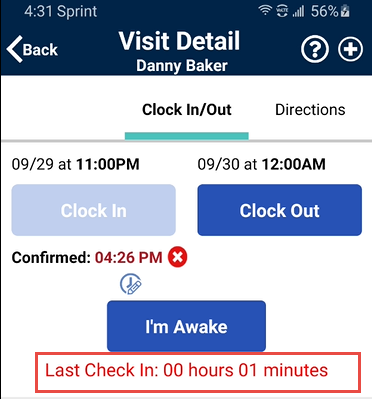 Once the feature is enabled, the Caregiver is presented with an I'm Awake button after Clock-In as proof that they are awake and servicing the Patient.