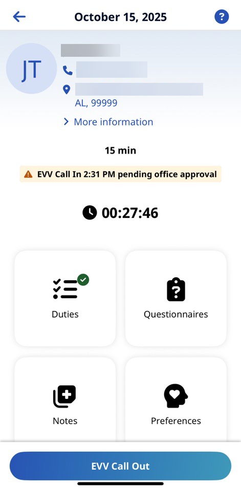 The Caregiver is alerted when 15 minutes of authorized Visit Time remains, and a countdown to the expiration of authorized Visit Time is displayed.