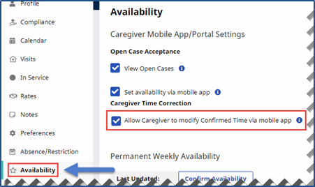 Select Caregiver can set Availability options via Mobile App checkbox.
