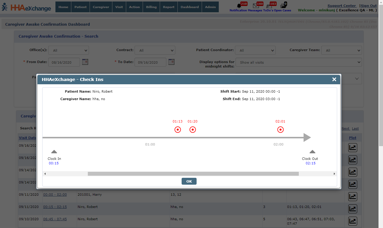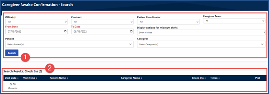 Providers can review and monitor activity via the Caregiver Awake Confirmation Dashboard under Visit > Caregiver Awake Confirmation Dashboard. This Dashboard is comprised of two sections to include search filters and search results.