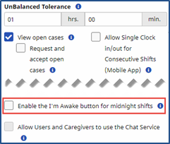 The Caregiver Awake Alert Confirmation feature applies to Caregivers who work overnight shifts. When this feature is enabled, a Caregiver is presented with an I'm Awake button at Clock-IN. This function serves as proof to the Agency that the Caregiver is awake and monitoring the Patient. The Caregiver can periodically check in via the I’m Awake button throughout the visit.