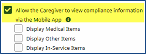 To enable this feature, go to the Office Setup page under Admin > Office Setup. On the Mobile section, select the Allow the Caregiver to view Compliance information via the Mobile App checkbox.