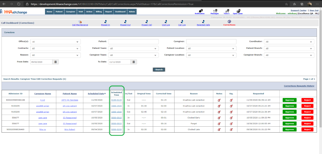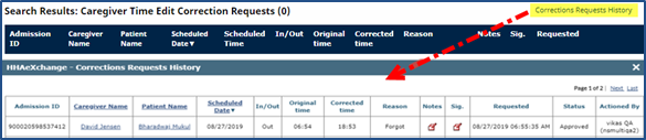 Caregiver requesting correction. Click the Caregiver Name to route to the Caregiver Calendar. |