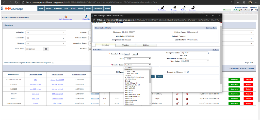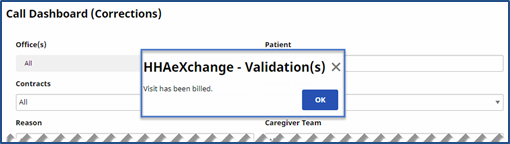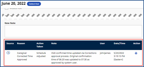 to approve the request (if validation passes). Upon confirmation, the visit is updated with the Caregiver requested times and the visit reason and the record is removed from the results and logged in History.
