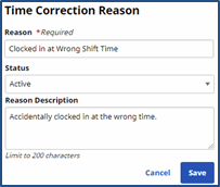To edit, click the Reason name link. The Time Correction Reason window opens. Enter the required Reason field and enter a Reason Description (optional). Click Save.
