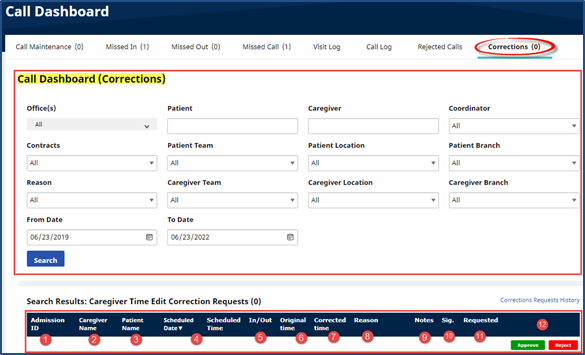 To track Caregiver Time Edit Requests go to the Corrections page on the Call Dashboard under Visit > Call Dashboard. Once a Caregiver submits a Correction, these requests are routed to the Call Dashboard Corrections page, comprised of two sections: Search and Results.