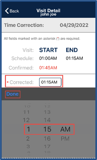The Time Correction page opens. Select the correct time in Corrected (required) and tap Done.