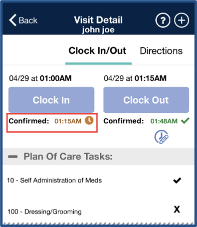 this Caregiver is presented with an edit icon next to the blank confirmed time (--:--).This option would be selected when the Caregiver forgot to Clock-In and/or Clock-Out. |