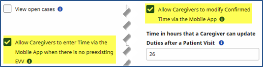 To allow Caregivers to request Mobile App EVV Time Edits, go to the Edit Office page under Admin > Office Setup. Under the Mobile section, select the Allow Caregivers to Modify Confirmed Time via Mobile App and/or Allow Caregivers to enter Time via the Mobile App when there is no preexisting EVV.