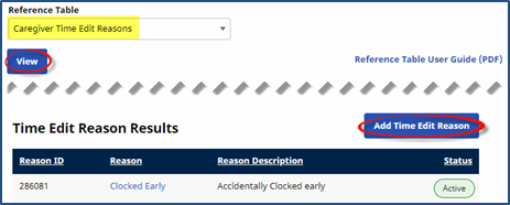 The Caregiver Time Edit Reasons are created and managed via the Reference Table Management function under Admin > Reference Table Management. Select Caregiver Time Edit Reasons from the Reference Table field to access. Click the Add Time Edit Reason button to add a reason.