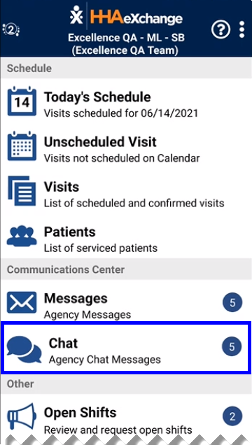 Once configured at the Agency level, Caregivers see the Chat menu item on the home screen as seen in the image to the right. The number bubble indicates the number of chat sessions containing one or more unread chats.