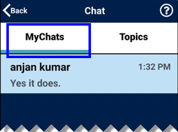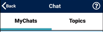 Upon selecting Chat from the Home screen, the Chat feature opens to display two tabs: MyChats and Topics. Each tab is covered in detail in the sections below.