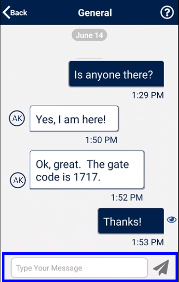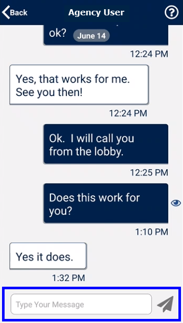 The Agency user’s name displays in the header and their messages appearswith a white background. Response messages appear on the right with a dark blue background. The Caregiver can enter up to 6 lines of text and click the paper plane icon to send the response message. The last read message by the Agency user is denoted with an eye icon.