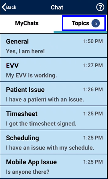Topics are defined and activated by the Agency. If an Agency does not enable a Topic(s), then the Topics tab does not display on the Mobile App for the Caregiver. The Topics tab allows a Caregiver to initiate a chat pertaining to a selected topic such as General, Timesheet, Patient Issue, EVV, Scheduling, and Mobile App Issue.