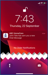 Push notifications alert Caregivers that chat messages haven been received when they are not logged into the HHAeXchange Mobile App. Click the notification on the screen to go to the Chat page once authenticated. The Caregiver can immediately view the message and act accordingly, right after it is issued by the Agency.