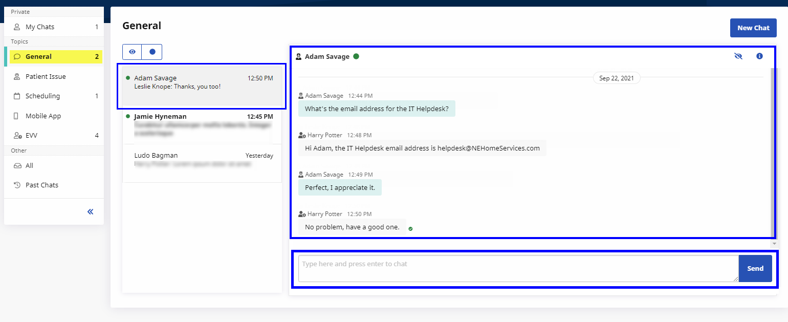 To view and manage chats in a Topic, select the Topic from the left navigation bar. Only Topics that the Agency user is assigned to appear in the menu. The example below illustrates a Chat thread from the General Topic.