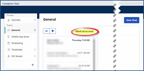 When a new user is added to a chat Topic and logs in to the system, all previous existing chat sessions are displayed for the user as Unread, making it difficult for a new user to identify new messages. To facilitate this issue, the user can Click the Mark all as read link that appears on the Topics screen.
