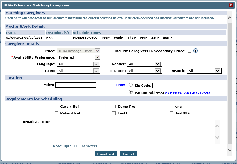 When selecting the Quick Broadcast option, the Quick Broadcast window opens prompting User to create a note (such as Open Shift information) and click the Broadcast button to broadcast the visit.