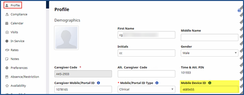 Agencies may restrict access to the Mobile App by linking the Caregiver’s Mobile IDto a Mobile Device ID. To link these two values, Agencies must enter the Mobile Device ID in the Caregiver Profile.