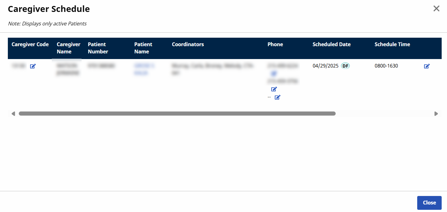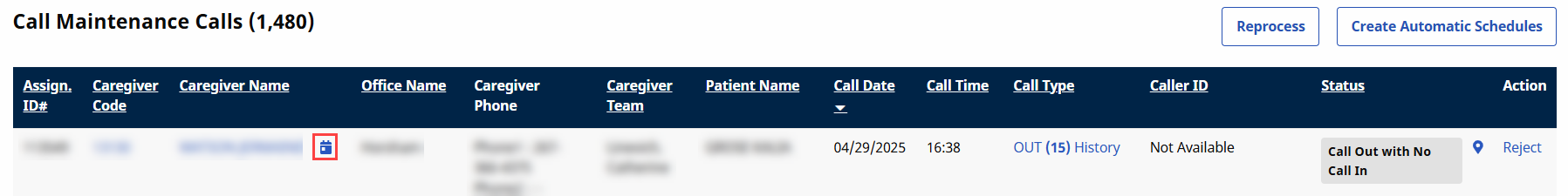 Edit icons are also available on the Caregiver Schedule window to make necessary adjustments to resolve the issues for the call.