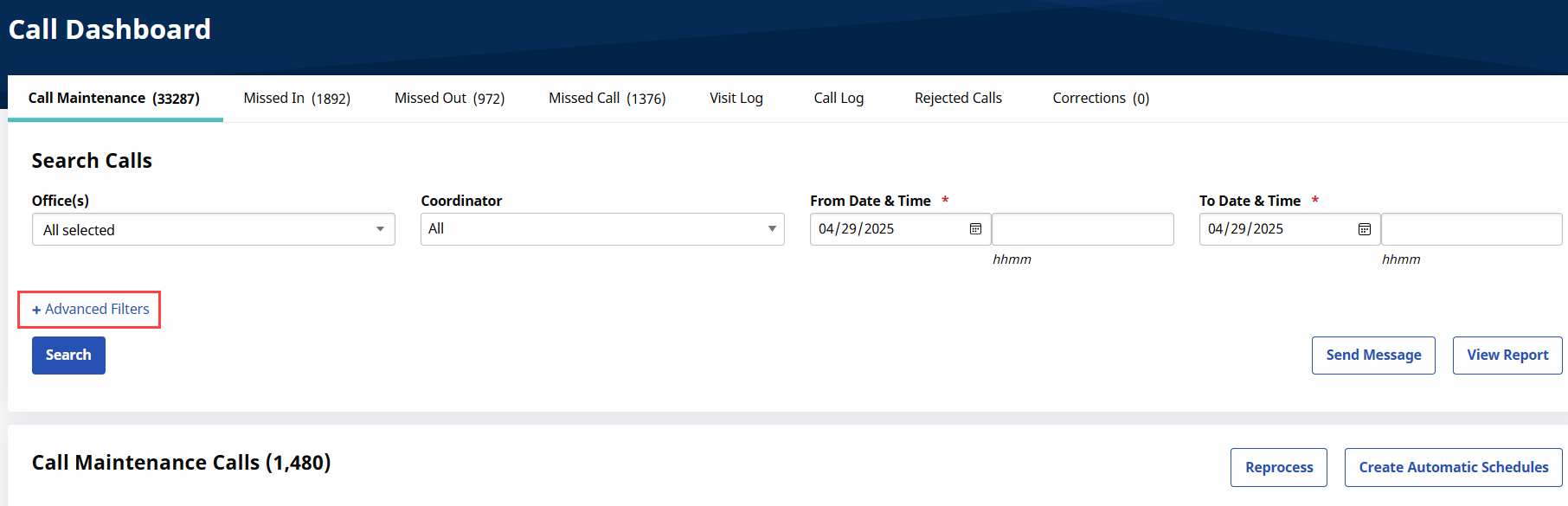 On the Call Dashboard page, the various buckets are now organized in tabs (1). While all search filter fields are available to select criteria, only essential ones initially display. To see all search filter fields, click + Advanced Filters (2).