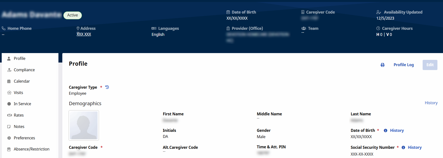 As with the Patient module, the same changes have been applied to the Caregiver module. The Caregiver Profile page displays the Caregiver header and relocated Edit button.