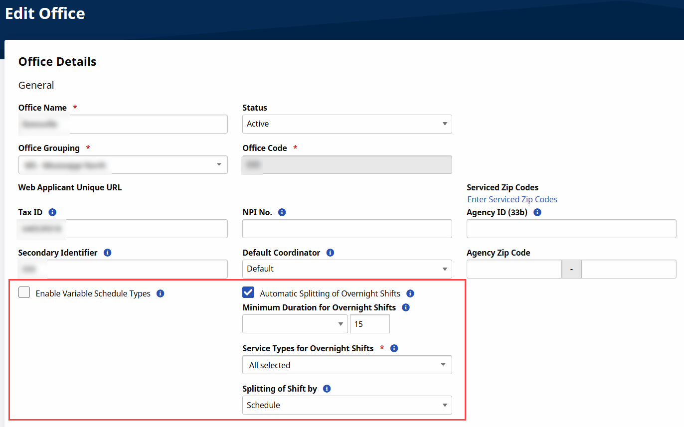 In the Edit Office page, fields are organized horizontally. In the General section, several fields have been added to integrate new features, such as Variable Schedule Types and Automatic Splitting of Overnight Shifts.