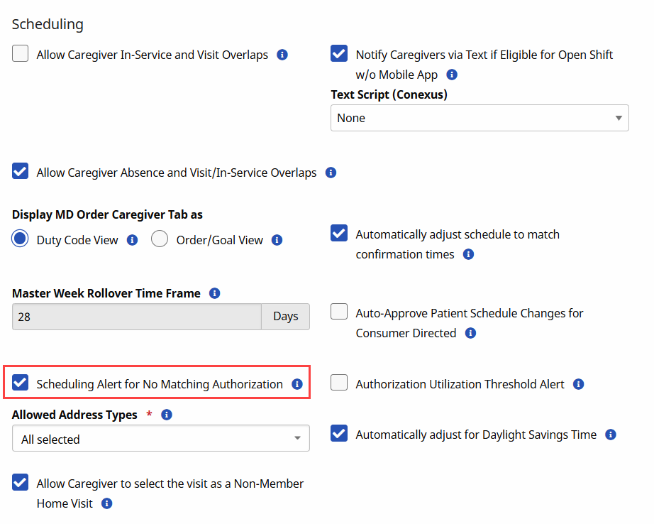 In the Scheduling section, the Scheduling Alert for No Matching Authorization feature has also been added.