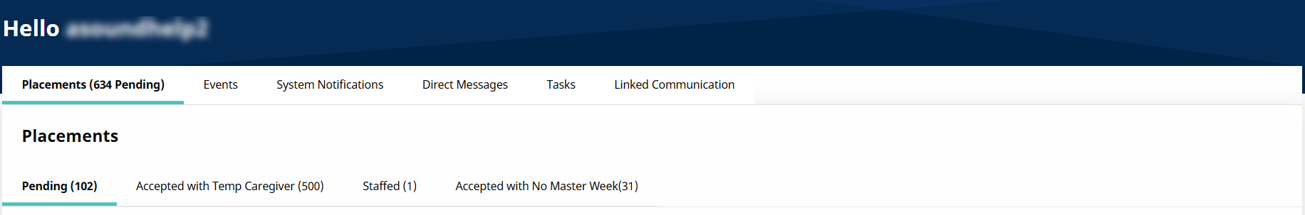The system opens directly to the Home page, showing the Username at the top. In the new UI, the various sections are now under tabs rather than listed as sections in one page. The tabs include Placements, Events, System Notifications, Direct Messages (formerly Messages), Tasks (formerly To-Do’s), and Linked Communications. The Placements tab opens by default.