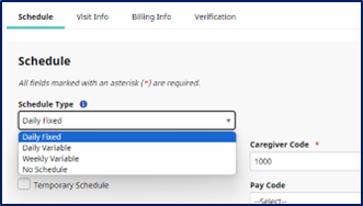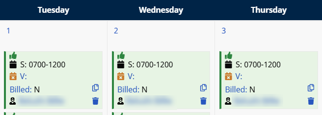 Icons have been added to the calendar date cells to showcase the Schedule Type (if applicable), Duration, Visit Times, Billed, and Caregiver. Other icons include copy and delete visit.