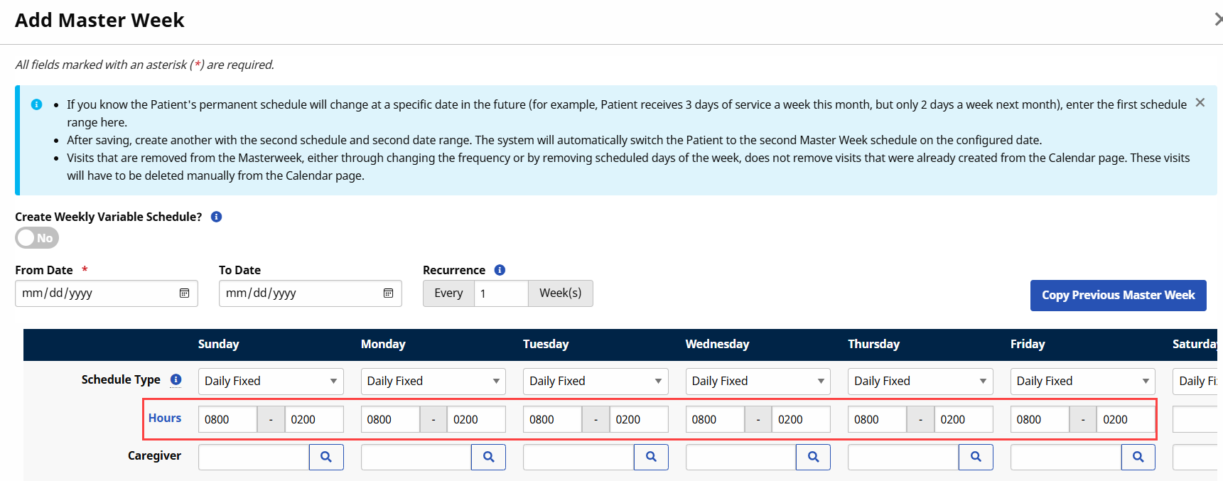 Several changes have been applied to the Master Week function in the new UI, described in the following subsections.