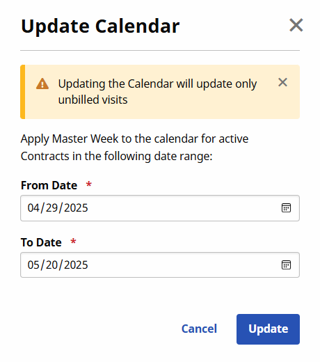Click the Update Calendar button to open the Update Calendar window to apply the new date range to the Master Week. Click Update to save the changes.