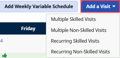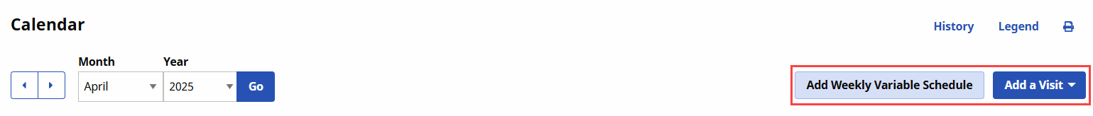 The Patient Calendar has some additions to include the Add Weekly Variable Schedule (specific to some markets) and Add a Visit button, located at the top-right of the calendar.