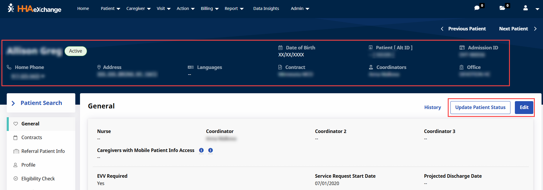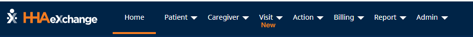 The navigation panel is the same consisting of Home, Patient, Caregiver, Visit, Action, Billing, Report, and Admin modules. The navigation menu remains static across the top to easily toggle between modules.