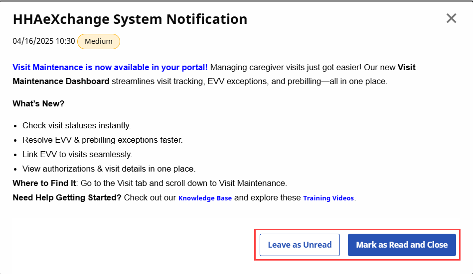 As customary in the classic system, System Notification alerts display upon successfully logging in. In the new format, all issued notifications appear with a right scroll to indicate multiple unread messages. From here, users can choose Leave as Unread or Mark as Read and Close.