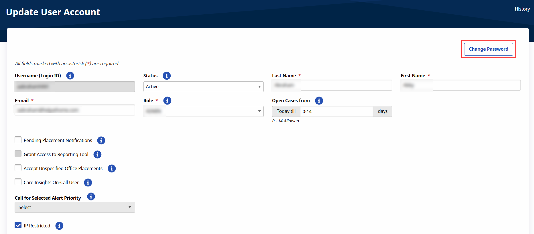 While functionality remains the same in the User Account page under Admin > User Management > Search User, some features such as Change Password are now more prominent, as a button at the top-right of the page. In addition, fields are organized horizontally.
