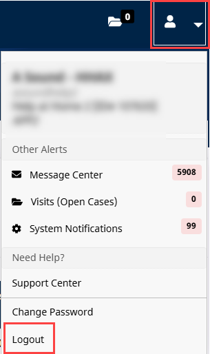 The User Profile Menu is located at the top right of the Navigation Panel providing access to Alerts, Support options, and the Logout function. By clicking the person icon, the menu opens, displaying the User (username), the Agency, Agency ID, and the System Environment.