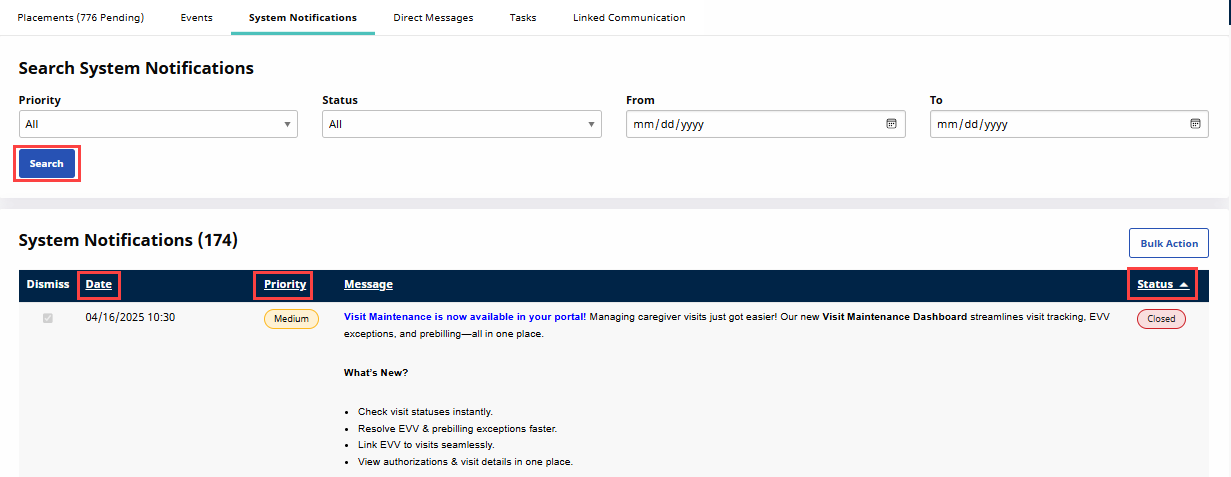 Messages are moved to the System Notifications tab, where users can search for all notifications by Date, Priority and Status.